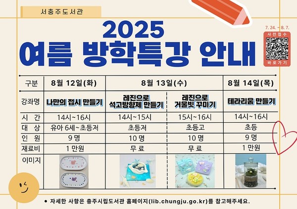 (충주=국제뉴스) 김상민 기자 = 서충주도서관(관장 최은숙)은 여름방학을 맞아 유아와 어린이를 대상으로 '2025년 여름방학 특강'을 운영한다고 23일 밝혔다.