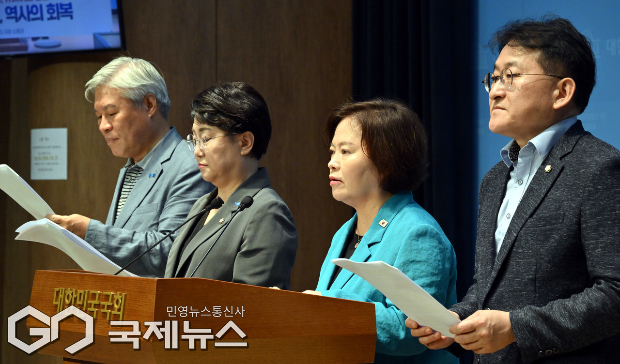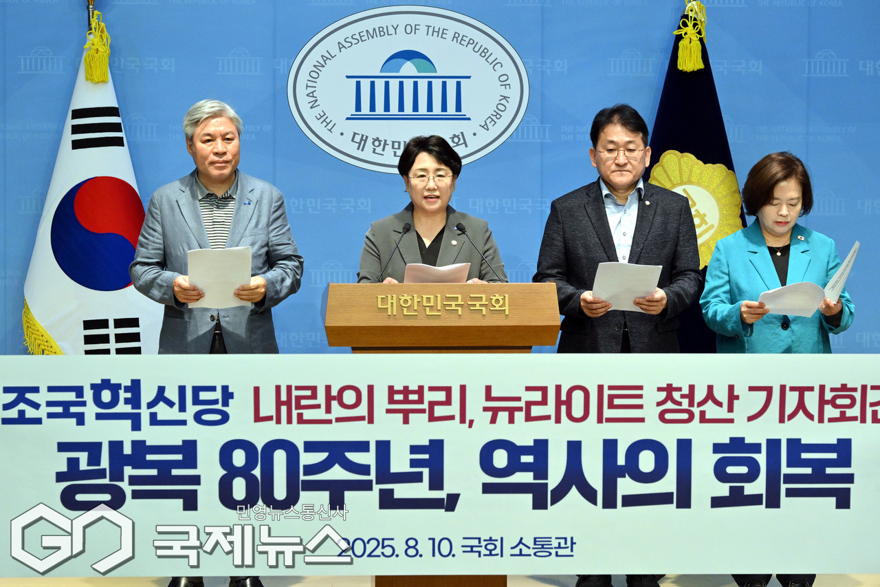 (서울=국제뉴스) 김선민(왼쪽 두번째) 조국혁신당 당대표 권한대행과 의원들이 10일 서울 여의도 국회 의원회관에서 '내란의 뿌리, 뉴라이트 청산 기자회견'을 열고 발언을 하고 있다. 왼쪽부터 서왕진 원내대표, 김선민 당대표 권한대행, 차규근 최고위원, 정춘생 정책위의장./사진=이용우 기자