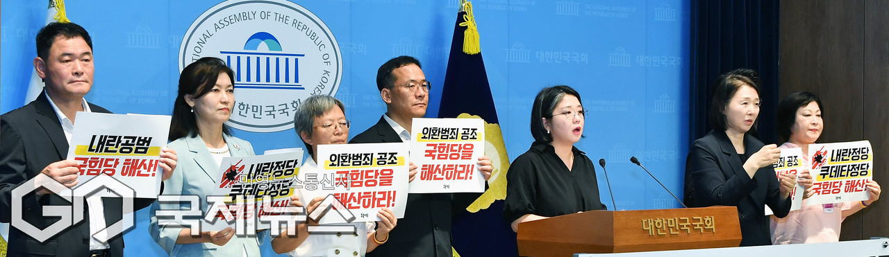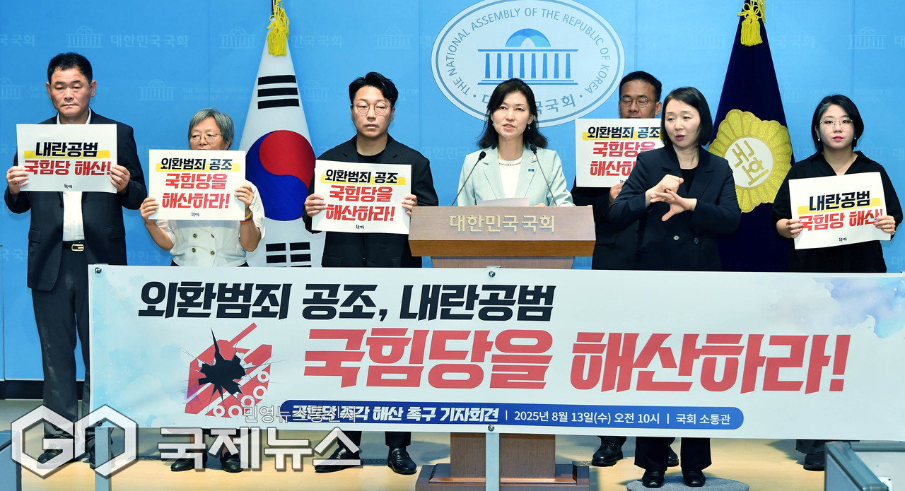 (서울=국제뉴스) 용혜인 기본소득당 대표, 강경숙 조국혁신당 의원, 촛불행동 등 시민단체 회원들이 13일 서울 여의도 국회 소통관에서 '외환범죄 공조, 내란공범 국민의힘 해산' 촉구 기자회견을 하고 있다./사진=이용우 기자