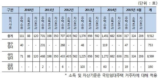 17일 국회 국토교통위원회 소속 김태원 의원(새누리당)이 LH에서 제출받은 자료에 따르면, 지난 2010년부터 올 6월까지 주택소유, 소득ㆍ자산 초과 등으로 임대차계약이 해지된 사례가 총 9512건이었다.