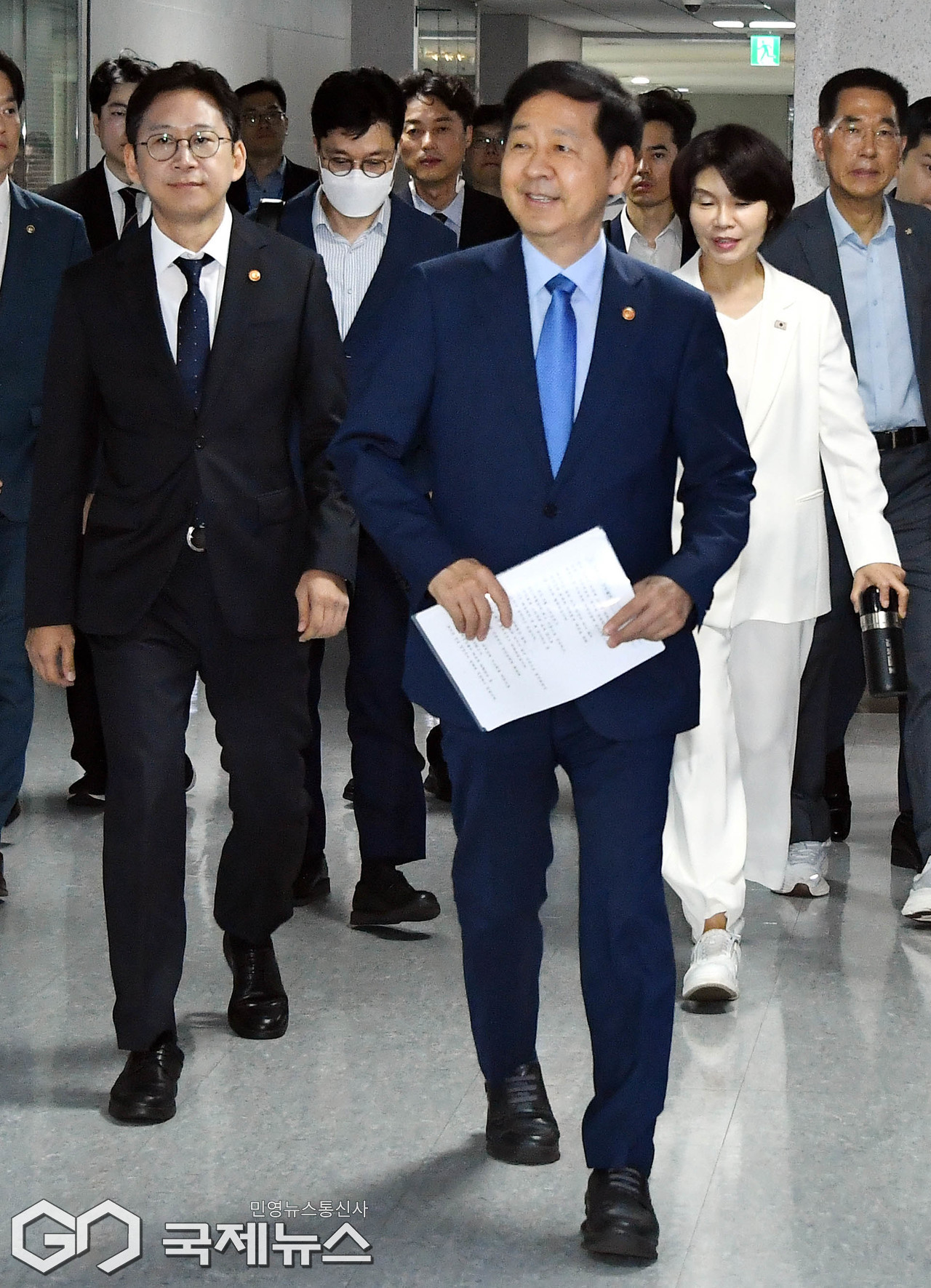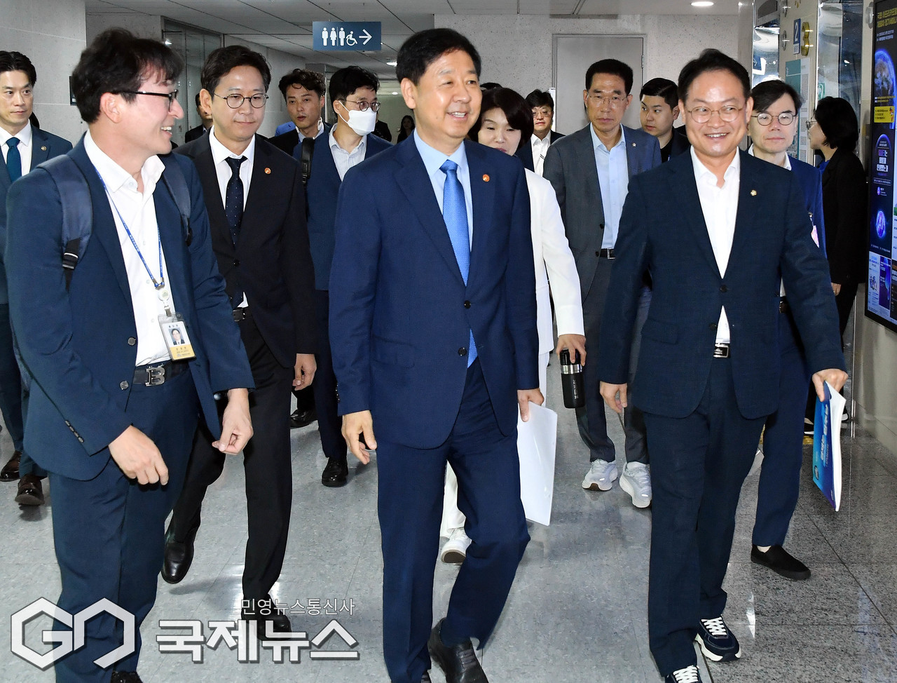 (서울=국제뉴스) 구윤철 부총리 겸 기획재정부 장관과 배경훈 과학기술정보통신부 장관등이 20일 오전 서울 여의도 국회 의원회관에서 열린 '새정부 경제성장전략 당정협의회'에 참석 하고 있다./사진=이용우 기자