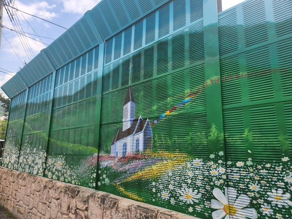 (평창=국제뉴스) 서융은 기자 = 미탄면의 관문인 미탄중학교 방음벽이 청옥산 육백마지기를 주제로 한 벽화로 새롭게 단장돼 주민들의 호평을 받고 있다.