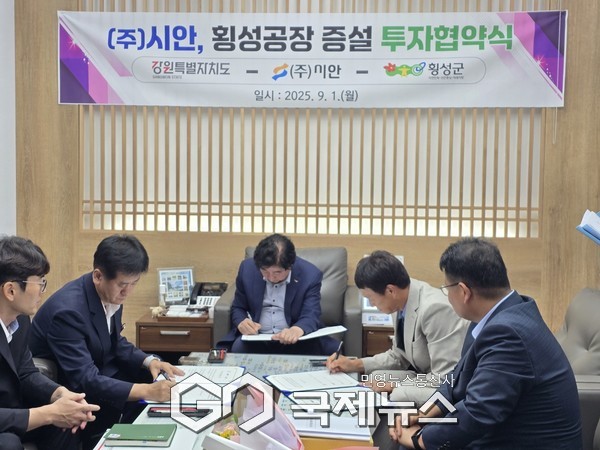 (춘천=국제뉴스) 최옥현 기자 = 강원특별자치도와 횡성군은 1일 플라스틱 덕트 및 창호 전문 제조업체인 ㈜시안과 19억 원 규모의 투자협약을 체결했다.