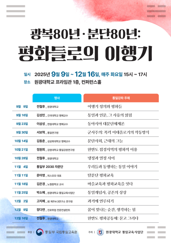 (익산=국제뉴스) 송영심 기자 = 원광대학교(총장 박성태) 통일교육사업단은 2025학년도 2학기 ‘명사초청 통일대담’을 오는 9월 9일부터 12월 16일까지 교내 프라임관 컨퍼런스홀에서 진행한다.