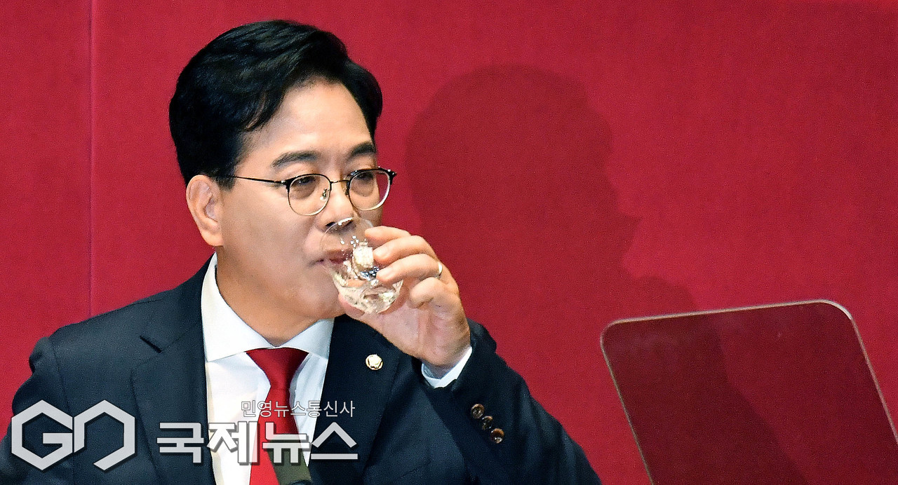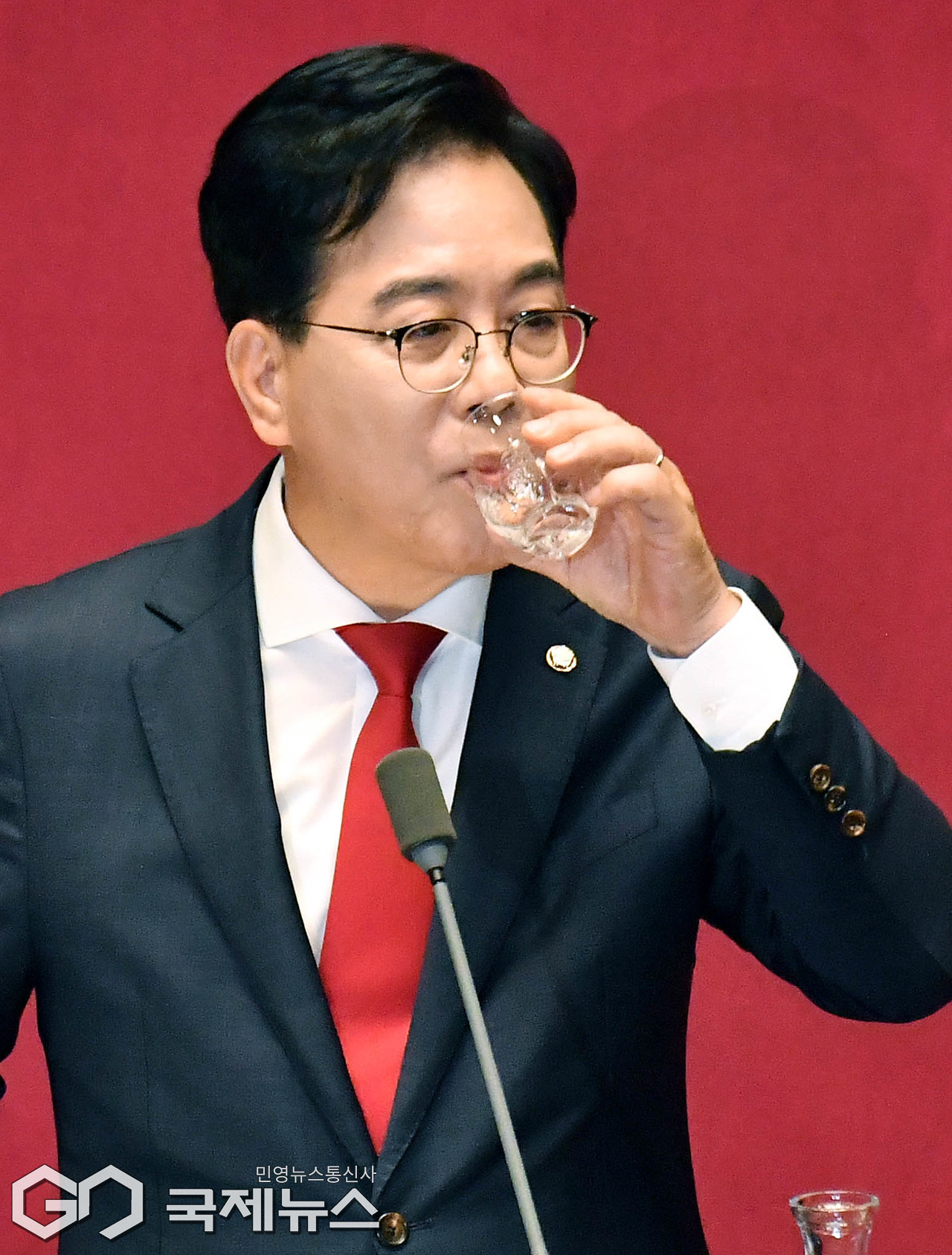 (서울=국제뉴스) 송언석 국민의힘 원내대표가 10일 오전 서울 여의도 국회에서 열린 제429회국회(정기회) 제3차 본회의에서 국정에 관한 교섭단체 대표연설을 하며 물을 마시고 있다./사진=이용우 기자