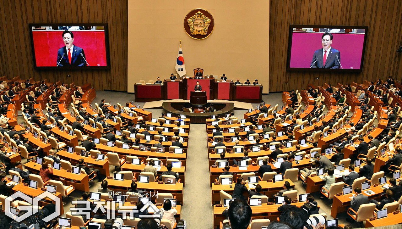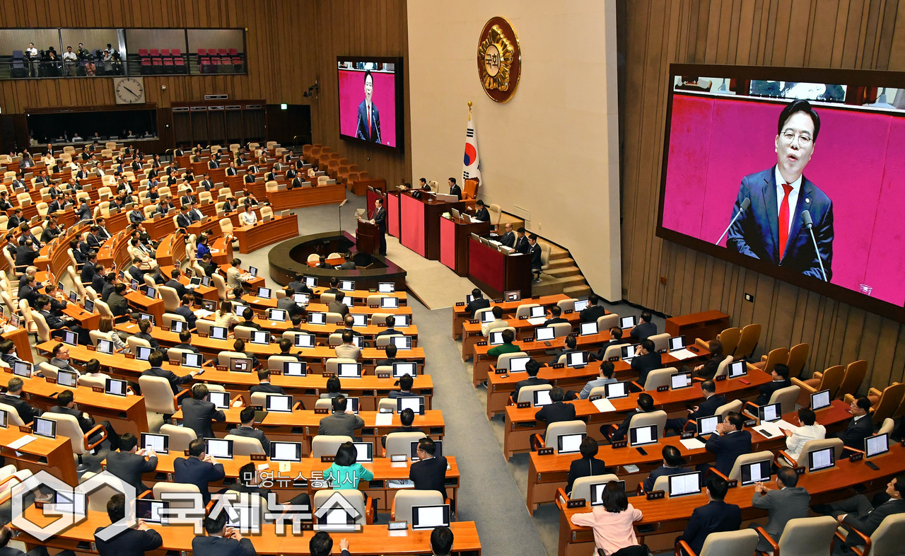 (서울=국제뉴스) 송언석 국민의힘 원내대표가 10일 오전 서울 여의도 국회에서 열린 제429회국회(정기회) 제3차 본회의에서 교섭단체 대표연설을 하고 있다./사진=이용우 기자
