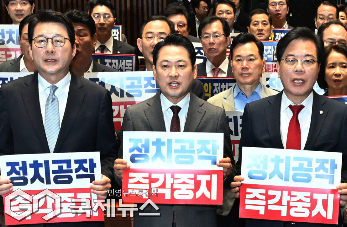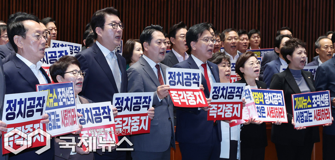 (서울= 국제뉴스) 장동혁 국민의힘 대표와 송언석 원내대표를 비롯한 의원들이 19일 오전 서울 여의도 국회에서 열린 의원총회에서 '정치공작 즉각중지' 손피켓을 들고 구호를 외치고 있다./사진=이용우 기자