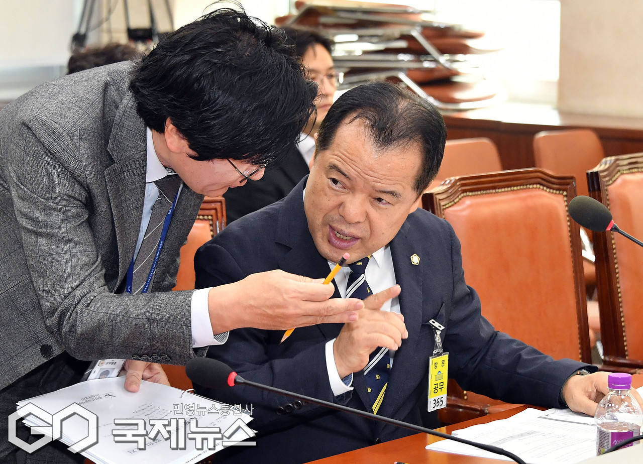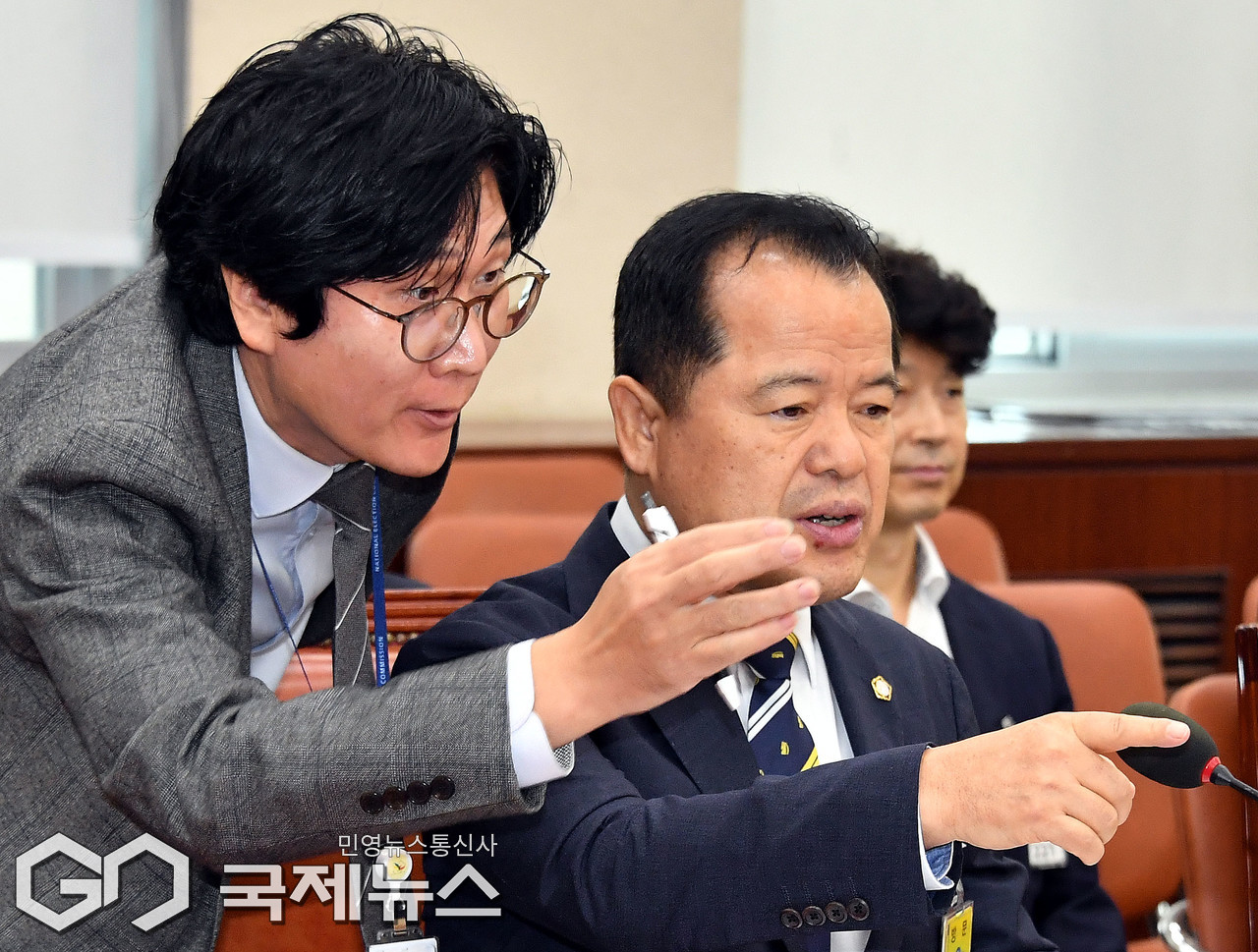 (서울=국제뉴스) 위철환 중앙선거관리위원 후보자가 1일 서울 여의도 국회에서 열린 행정안전위원회의 인사청문회에서 관계자와 대화하고 있다./사진=이용우 기자