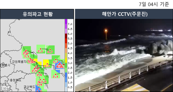 현재, 동해중부해상 유의파고/최대파고/파주기 현황(7일 04시 현재, 단위: 파고 m, 파주기 초)는 [앞바다] 강릉 3.2m,/4.8m,/5.7m, 삼척 2.9m,/5.8m,/8.3m, 등이다.