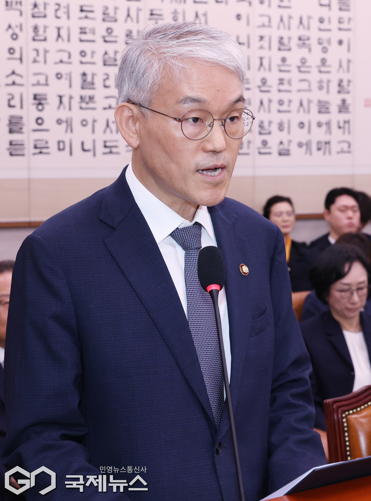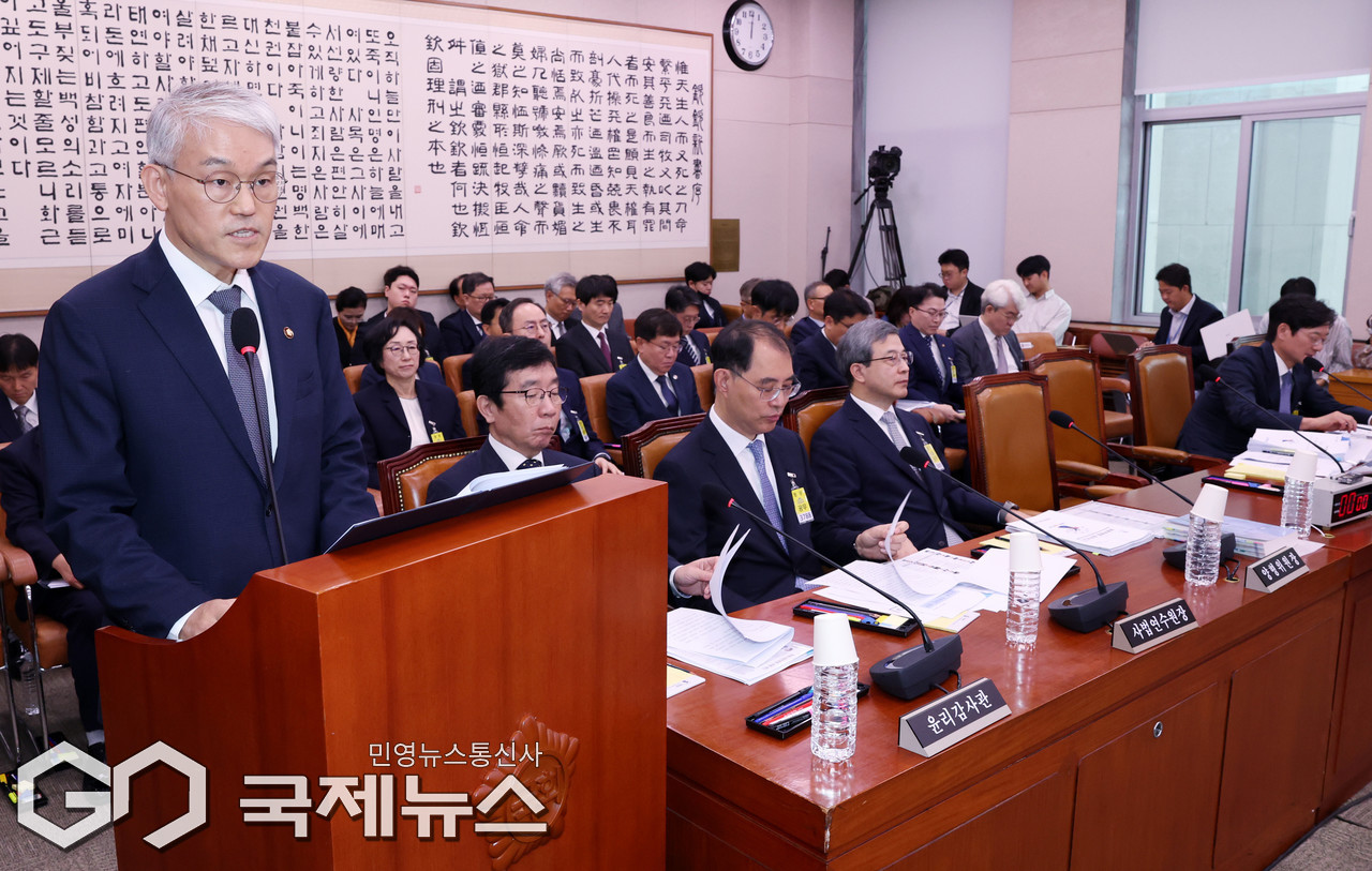 (서울=국제뉴스) 천대엽 법원행정처장이 13일 서울 여의도 국회에서 열린 법제사법위원회의 대법원 등에 대한 국정감사에서 인사말을 하고 있다./사진=이용우 기자