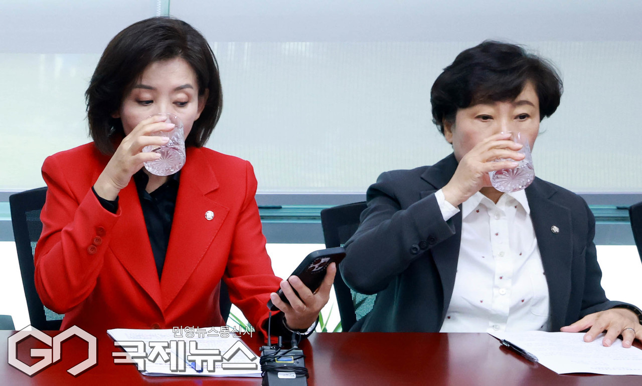 (서울=국제뉴스)나경원 국민의힘 의원과 조배숙 의원이 19일 오후 서울 여의도 국회 의원회관에서 열린 '추미애 방지법·김현지 방지법 관련 기자간담회'에서 물을 마시고 있다./사진=이용우 기자