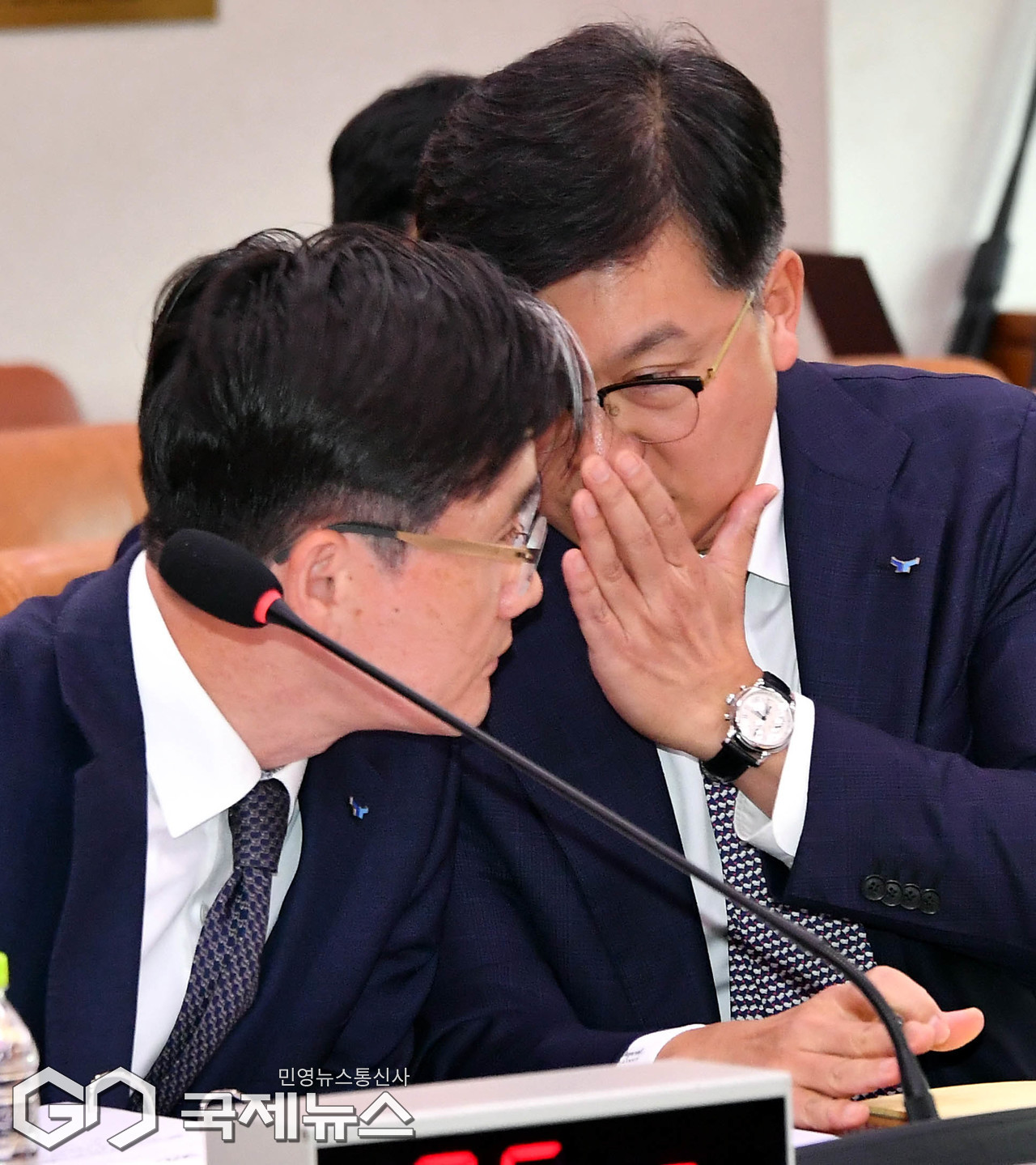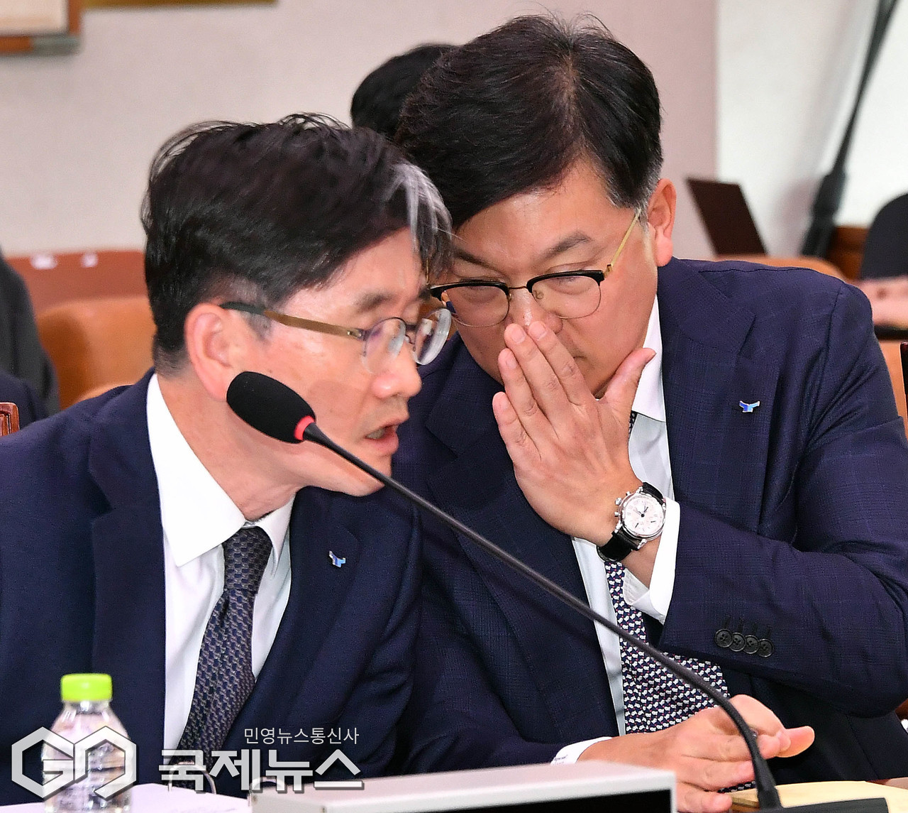 (서울=국제뉴스) 오동운 고위공직자범죄수사처장이 24일 오후 서울 여의도 국회 법제사법위원회에서 열린 공수처에 대한 국정감사에 출석해 이재승 차장과 대화하고 있다./사진=이용우 기자