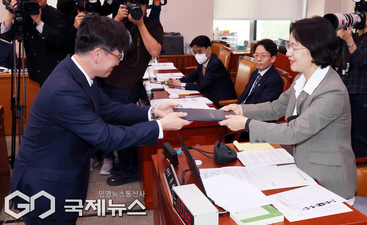 (서울=국제뉴스) 오동운 고위공직자범죄수사처장이 24일 오후 서울 여의도 국회 법제사법위원회에서 열린 공수처에 대한 국정감사에서 선서문을 제출하고 있다./사진=이용우 기자