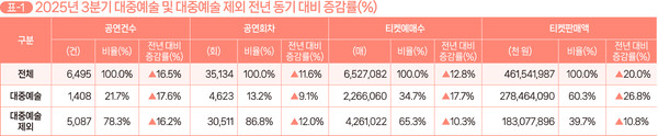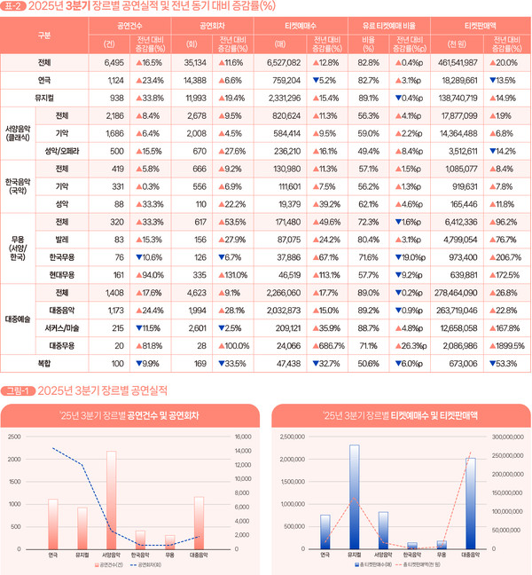 (재)예술경영지원센터는 2025년 7월부터 9월까지의 공연예술통합전산망(이하 KOPIS) 예매 데이터를 분석한 '2025년 3분기 공연시장 티켓판매현황분석보고서'를 발행했다.