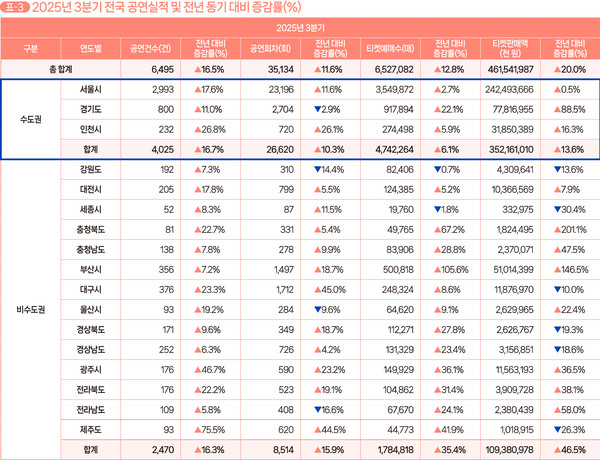 수도권·비수도권 모두 전년 동기간 대비 증가세, 수도권 공연 집중 완화