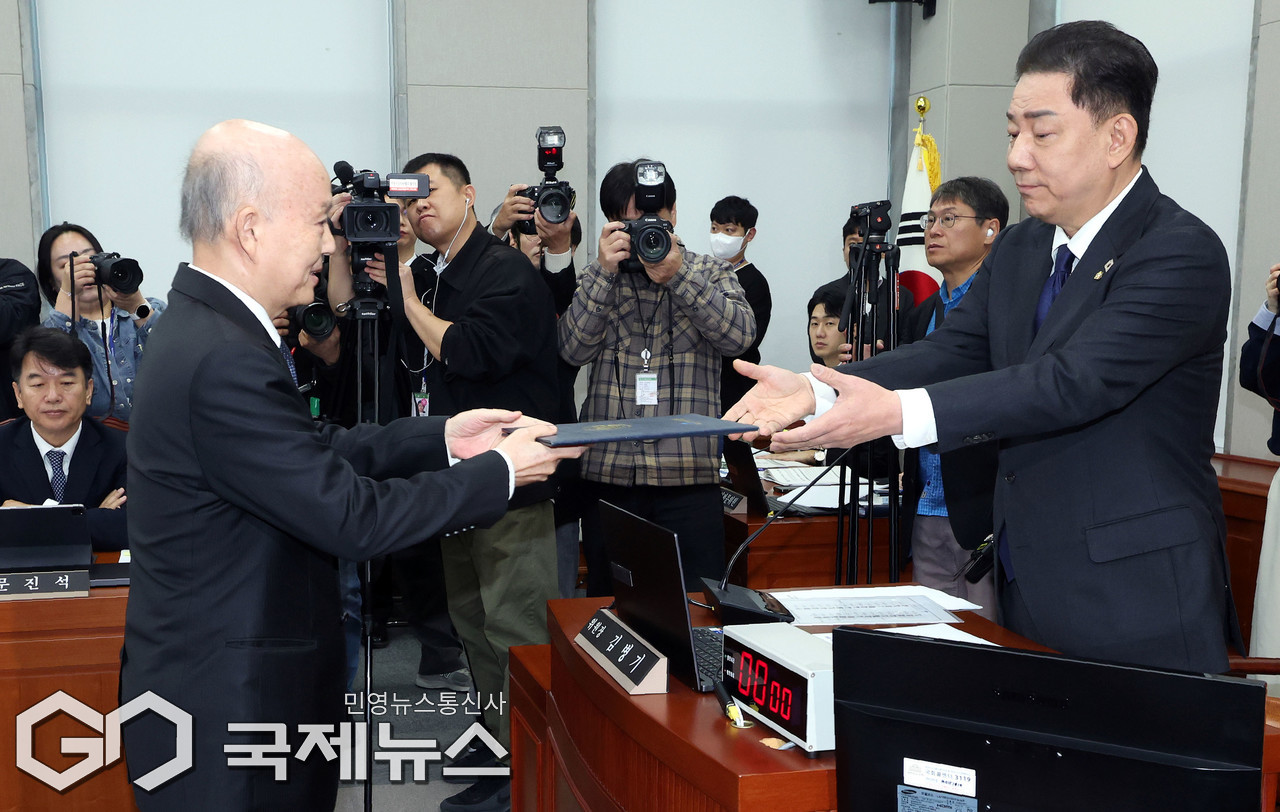 (서울=국제뉴스) 안창호 국가인권위원회 위원장이 5일 오전 서울 여의도 국회에서 열린 국회운영위원회 국정감사에서 선서문을 제출하고 있다./사진=이용우 기자