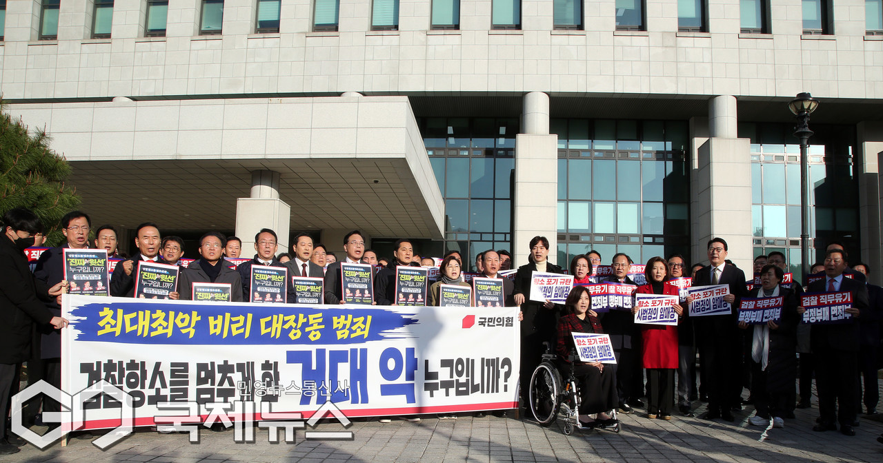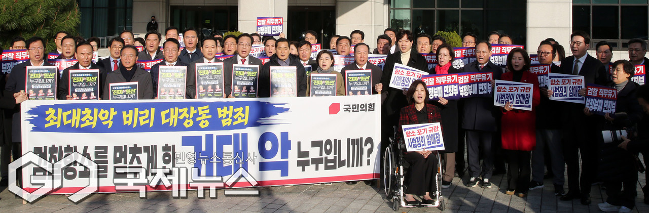 (서울=국제뉴스) 국민의힘 장동혁 대표와 송언석 원내대표 및 의원들이 11일 오전 서울 서초구 대검찰청 앞에서 검찰의 대장동 개발 비리사건 항소 포기 관련 긴급 현장 규탄대회를 열고 발언하고 있다./사진=이용우 기자