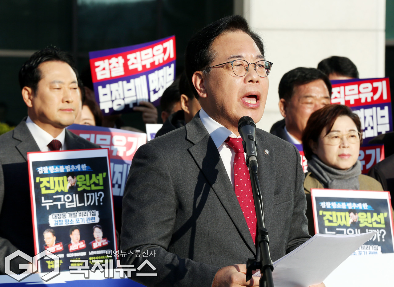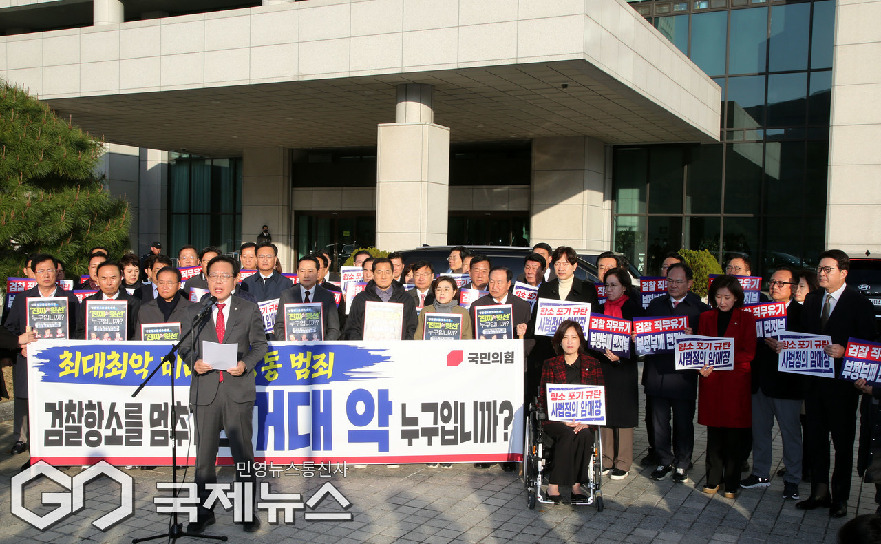 (서울=국제뉴스) 국민의힘 송언석 원내대표가 11일 오전 서울 서초구 대검찰청 앞에서 검찰의 대장동 개발 비리사건 항소 포기 관련 긴급 현장 규탄대회를 열고 발언하고 있다./사진=이용우 기자