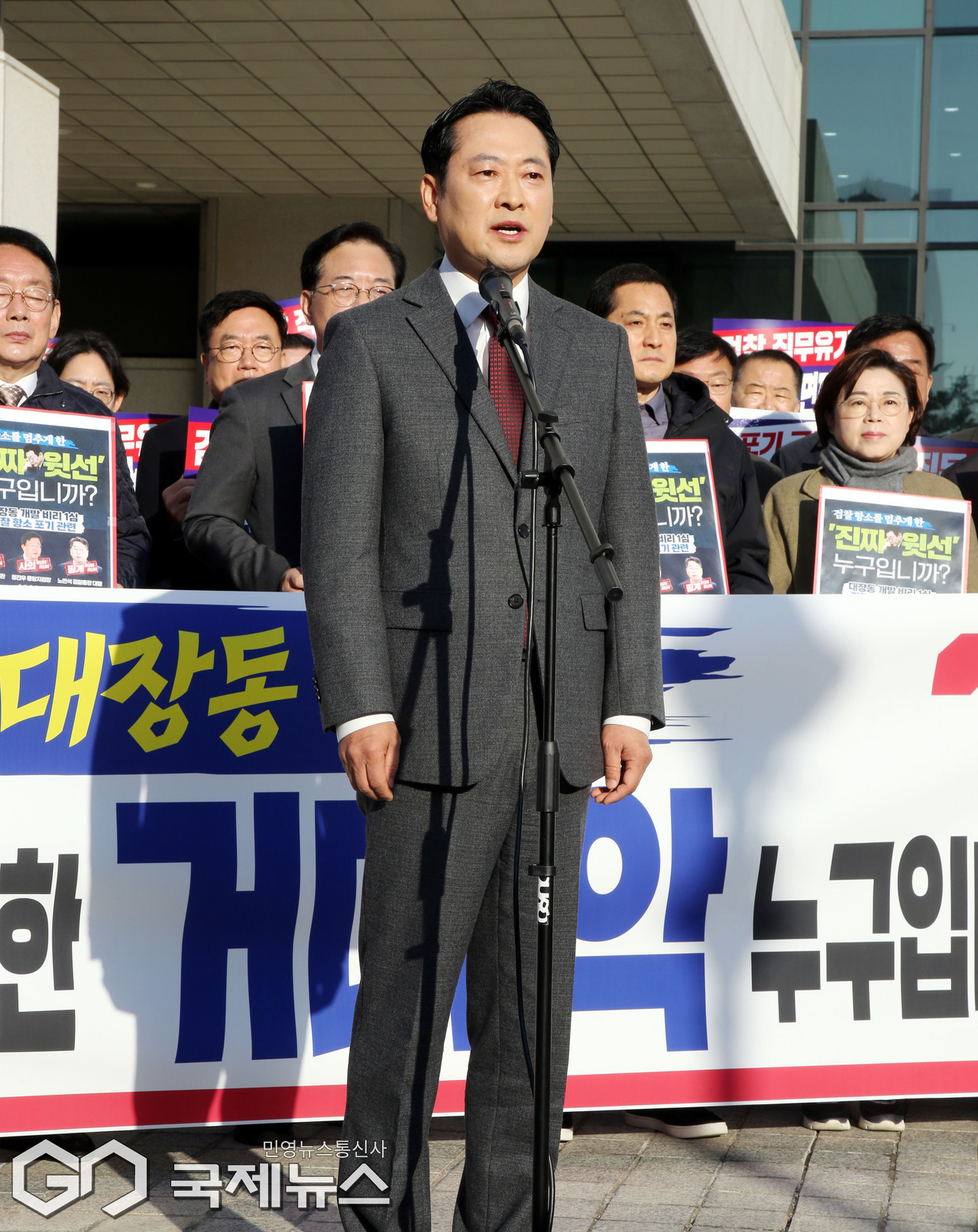 (서울=국제뉴스) 국민의힘 장동혁 대표가 11일 오전 서울 서초구 대검찰청 앞에서 검찰의 대장동 개발 비리사건 항소 포기 관련 긴급 현장 규탄대회를 열고 발언하고 있다./사진=이용우 기자