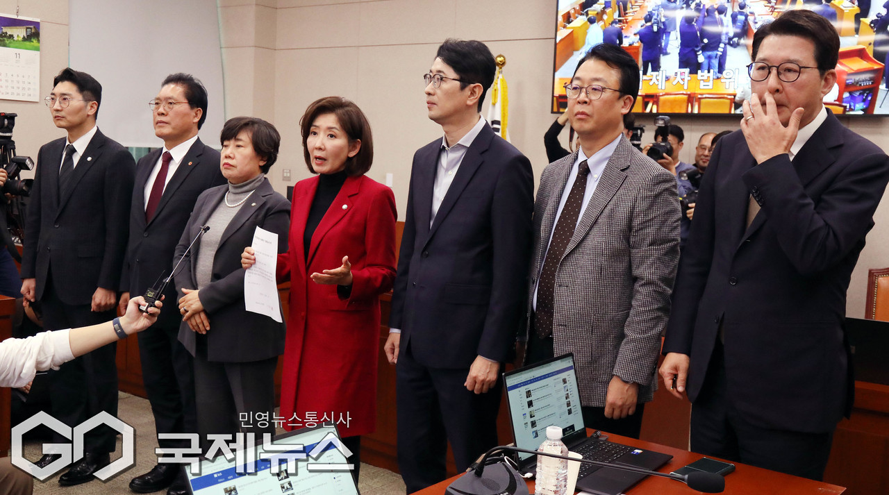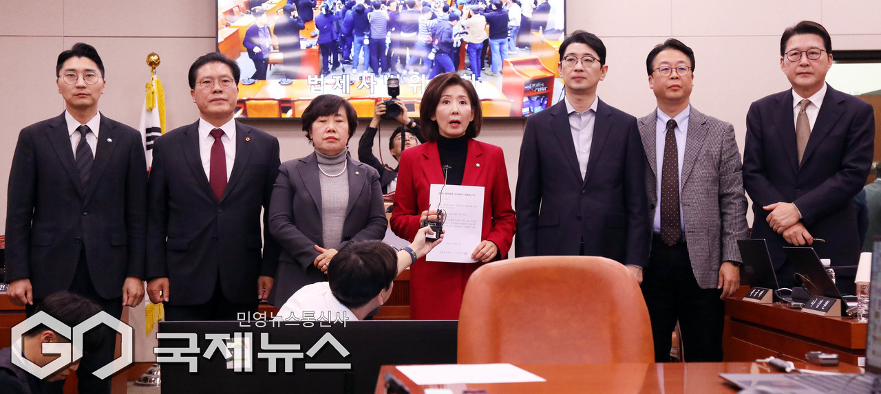 (서울=국제뉴스) 나경원 의원 등 국회 법제사법위원회 소속 국민의힘 의원들이 11일 오후 서울 여의도 국회 법제사법위원회 회의실에서 전체회의가 정회된 뒤 대장동 사건 항소심 포기 관련 입장을 밝히고 있다./사진=이용우 기자