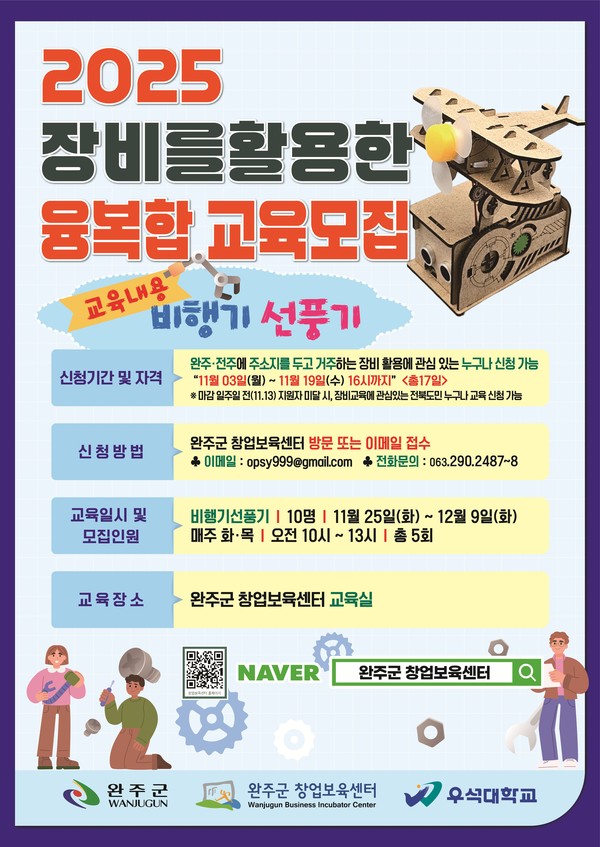 (완주=국제뉴스) 송영심 기자 = 완주군 창업보육센터가 ‘2025년 장비를 활용한 융복합 교육’ 참가자를 오는 19일, 오후 4시까지 모집한다.