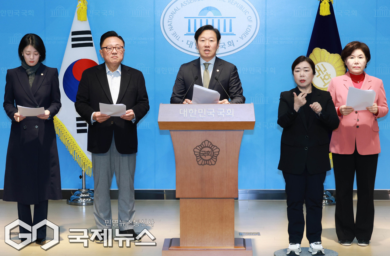(서울=국제뉴스) 배현진 국민의힘 서울시당위원장등이 18일 서울 여의도 국회 소통관에서 김민석 국무총리의 오세훈 서울시장 주요 사업에 대한 비판에 대해 "노골적인 관권선거 개입"이라고 주장하며 규탄 기자회견을 하고 있다./사진=이용우 기자