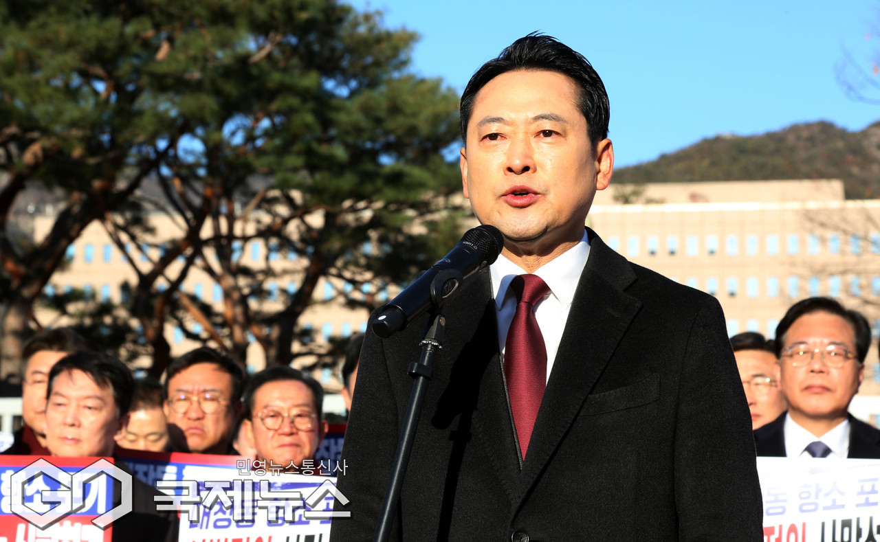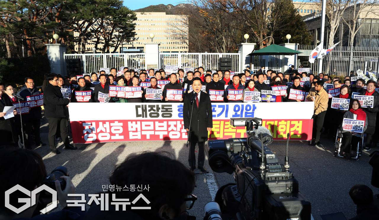 (서울=국제뉴스) 국민의힘 송언석 원내대표가 18일 오전 경기도 정부과천청사 앞에서 대장동 항소포기 외압 정성호 법무부장관 사퇴 촉구 기자회견에서 발언을 하고 있다./사진=이용우 기자