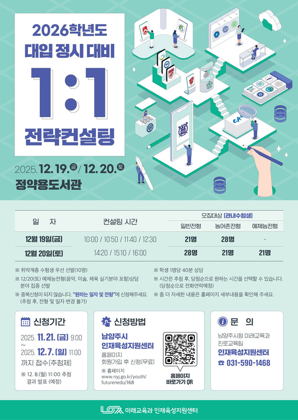 컨설팅은 12월 19일과 20일 이틀간 정약용도서관에서 열리며, 일반·농어촌·예체능 전형으로 구분해 진행된다.