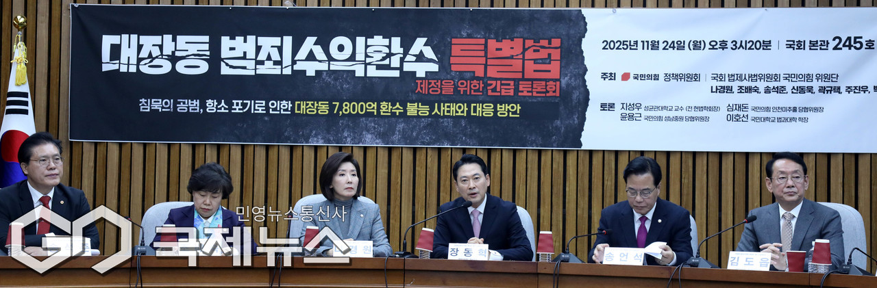(서울=국제뉴스) 장동혁 국민의힘 대표가 24일 오후 서울 여의도 국회에서 열린 '대장동 범죄수익환수 특별법 제정'을 위한 긴급 토론회에서 발언을 하고 있다다./사진=이용우 기자