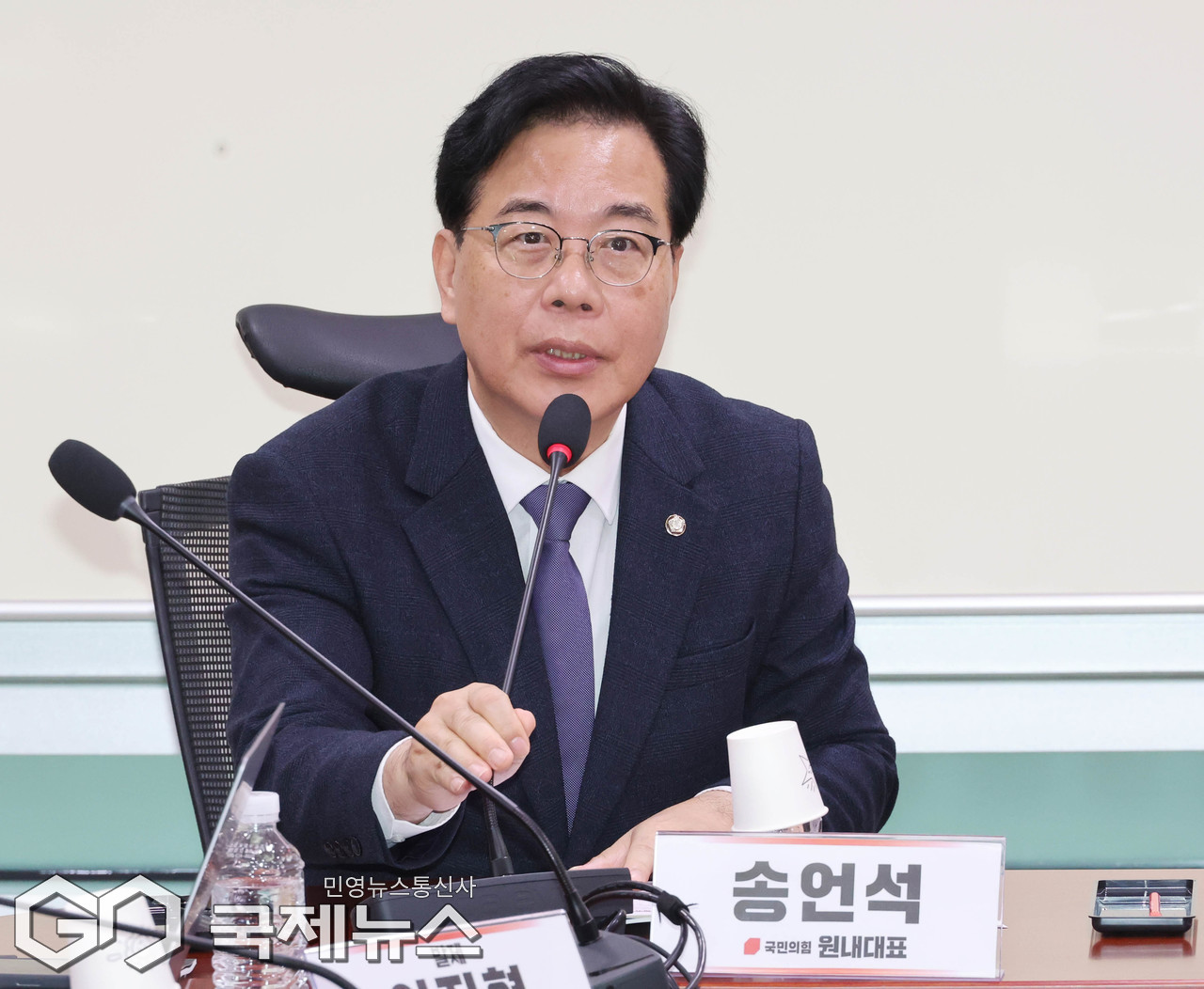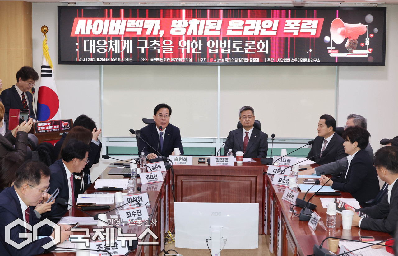 (서울=국제뉴스) 송언석 국민의힘 원내대표가 25일 서울 여의도 국회 의원회관에서 열린 '사이버렉카, 방치된 온라인 폭력: 대응체계 구축을 위한 입법토론회'에서 축사하고 있다./사진=이용우 기자