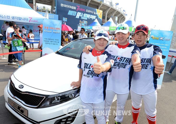 ▲ 올스타전에 참가한 기아타이거즈 김선빈, 차일목, 나지완 선수(왼쪽부터 차례대로)가 더 뉴 K5 차량 앞에서 포즈를 취하는 모습.(서울=국제뉴스) 기아자동차㈜는 19일, 포항 야구장에서 열린 '2013 한국야쿠르트 세븐 프로야구 올스타전'에서 최고의 활약을 펼친 '미스터 올스타' 선수에게 더 뉴 K5를 제공하고, 야구장을 방문한 야구팬들을 대상으로 '홈런왕 K게임 이벤트'를 실시하는 등 다양한 마케팅 활동을 펼쳤다.