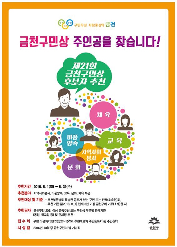금천구 관계자는 "제21회 구민의 날을 맞아 금천구의 발전에 기여한 공이 큰 구민을 발굴하고 금천구민으로서 자긍심을 높이고자 한다"며 "청소년부터 어르신까지 다양한 계층과 분야의 숨은 공로자가 선정될 수 있도록 많은 추천 바란다"고 말했다.
