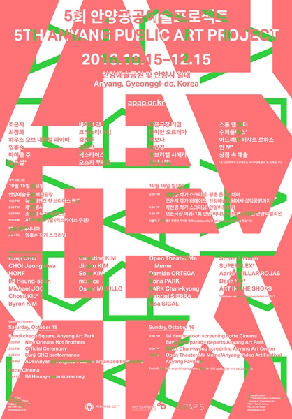한편, 안양공공예술프로젝트(APAP)는 2005년 1회를 시작으로 3년마다 개최되는 국내 유일 공공예술트리엔날레로, 지난 11년간 140점의 작품을 도시 전체에 선보여왔다.