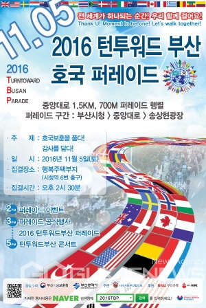다음달 5일 개최되는 '2016 턴투워드부산 호국퍼레이드'는 11월11일 턴투워드부산 국제추모 행사를 맞아 사전 홍보를 겸한 범시민 나라사랑 및 호국보훈 행사이다.