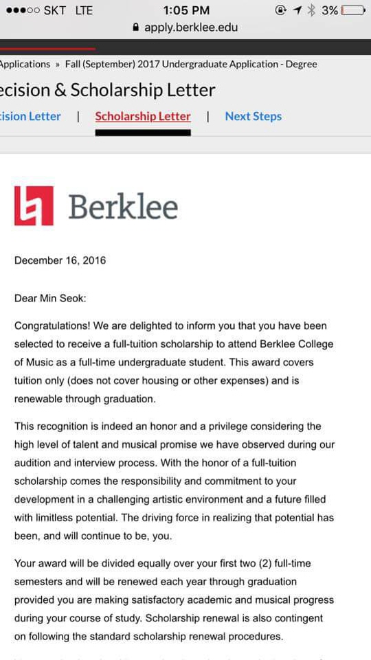 지난 11월 버클리 음대 오디션을 본 서민석 군은 드디어 12월 16일에 대학으로부터 이메일 한 통을 받았다. 외국학생이 합격하기도 벅찬 미국 보스턴의 사립 음악단과대학인 버클리 음대(Berklee College of Music)에 합격은 물론, 전액 장학금을 지급하겠다는 소식을 전했다.