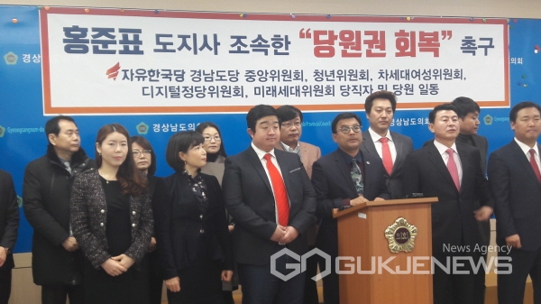 한국당 경남도당 중앙위원회, 청년위원회, 차세대여성위원회, 디지털정당위원회, 미래세대위원회, 온라인전략본부, SNS소통본부 등 청년당직자와 당원들은 이날 오전 11시 경남도의회 프레스센터에서 기자회견을 열어 "제19대 대통령 선거와 관련해 한국당 대통령 후보로 출마하는데 걸림돌이 되지 않도록 한국당 보수이념의 가치를 지켜 나갈 수 있는 경남의 대표 후보이자 보수 아이콘인 홍 지사의 당원권을 조속히 회복시켜야 한다"고 주장했다.