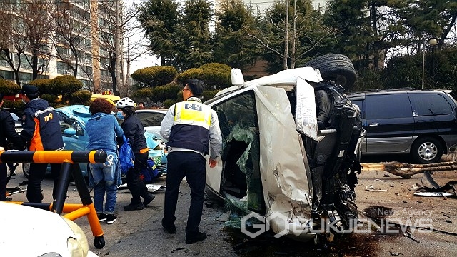 12일 오후 1시18분쯤 전북 군산시 나운동 스타벅스 네거리에서 김모(63ㆍ여)씨가 몰던 NF 소나타 승용차가 도로를 이탈해 아파트 담벼락으로 돌진했다.