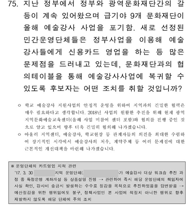 이로 인해 새롭게 민간운영단체들이 선정됐으며, 이들 민간단체 중에서 383명의 예술강사를 고용한 A 민간운영단체가 올해 3월 30일 예술강사 대상으로 '워크숍'을 열고, 특정 은행의 카드영업을 진행한 것으로 도종환 문체부 장관 후보자 인사청문회 요구자료를 통해 밝혀졌다.