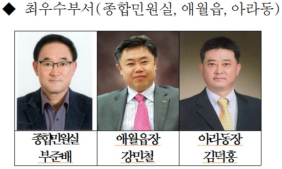 선정결과를 보면 최우수부서에 종합민원실(실장 부준배)와 애월읍(읍장 강민철), 아라동(동장 김덕홍)이 선정됐다.