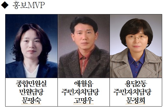 홍보MVP는 본청 민원담당 문명숙, 애월읍 주민자치담당 고명우, 용담2동 주민자치담당 문정희가 각각 선정됐다.
