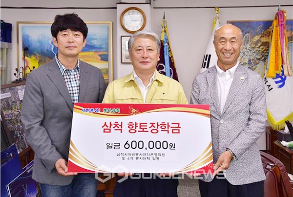 삼척시자원봉사센터는 지난 7월 중부지방 집중호우로 피해를 입은 청주시 수해현장을 찾아 수해로 생활터전을 잃은 수재민의 아픔을 함께 나누고 작은 힘이라도 보태고자 침수된 가옥 토사제거 등 봉사활동을 진행하였고, 수해현장까지 가기 위해 회원들이 십시일반 모은 여비에서 남은 전 금액(60만원)을 삼척시 향토장학금으로 전달했다.
