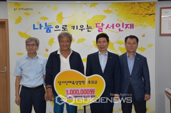 (대구=국제뉴스) 백운용 기자 = 김두환 월성2동 따뜻한 사람들의 모임 회장은 18일 달서구청을 찾아 지역 미래인재육성에 써 달라며 후원금 1백만원을 이태훈 (재)달서인재육성장학재단이사장에게 전달했다.