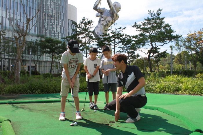 ‘미니골프’란 퍼터를 이용해 다양한 장애물을 통과한 후 홀컵에 공을 넣는 골프경기다.골프존조이마루는 아이들의 눈높이에 맞춘 놀이를 통해 지역 어린이들이골프를 쉽게 접하고, 즐겁게 골프의 기본과 예절을배울 수 있도록 돕기 위해 미니골프 프로그램을 기획했다.