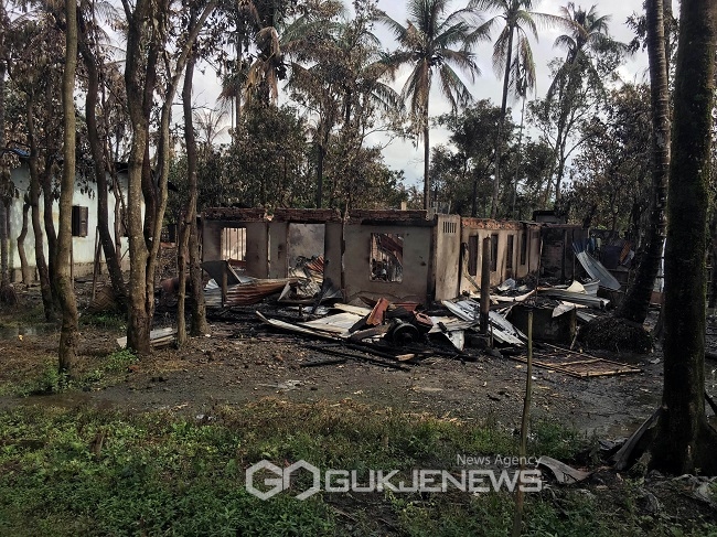 (미얀마=국제뉴스) 박원준 기자 = 12일(현지시간) 로힝야족이 거주하던 미얀마 라카인주 마웅다우 마을이 미얀마 정부군과 로힝야 반군과의 충돌로 집들이 불에 타있다.
