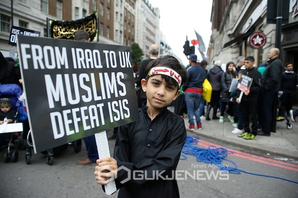 (영국=국제뉴스) 이상철 기자 = 영국 센트럴런던에서 열린 아슈라 행진 도중 한 소년이 ISIS(이슬람국가) 반대 팻말을 들고 있다.