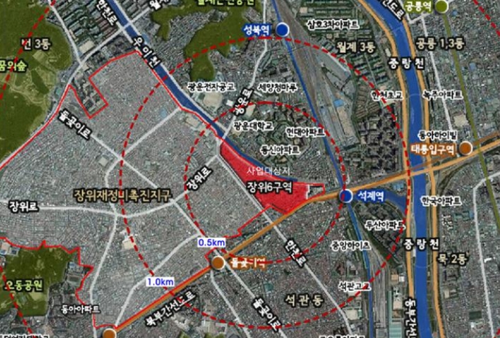 장위동 장위6재정비촉진구역 주택재개발사업구역은 서측으로 한천로(30m), 남측으로 화랑로(35m)와 접해 있고, 동측으로는 우이천이 및 구역내 설치 될 공공시설인 근린공원이 인접하여 자연환경이 우수하며 사업지에 인접하여 지하철1호선 석계역과 6호선 돌곶이역이 있어 대중교통이 매우 편리한 곳이다.