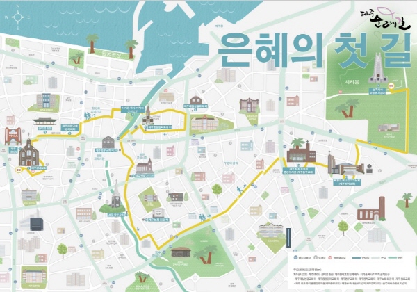 이 처럼 제주 순례길 '은혜의 첫 길'은 제주시 관덕정을 중심으로 초기 제주 기독교 선교 활동의 역사적 흔적과 동문시장·산지천의 현대적인 모습도 만나는, 과거와 현재의 모습이 교차하는 길이다.