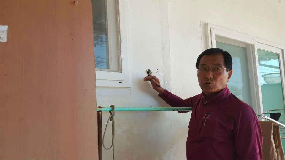 이 집은 기존 것 보다 작은 창호를 시공하고 남은 벽체 공간에는 방수석고보드를 시공했으나 작은 외부 충격에도 부숴 질 정도로 부실하다.