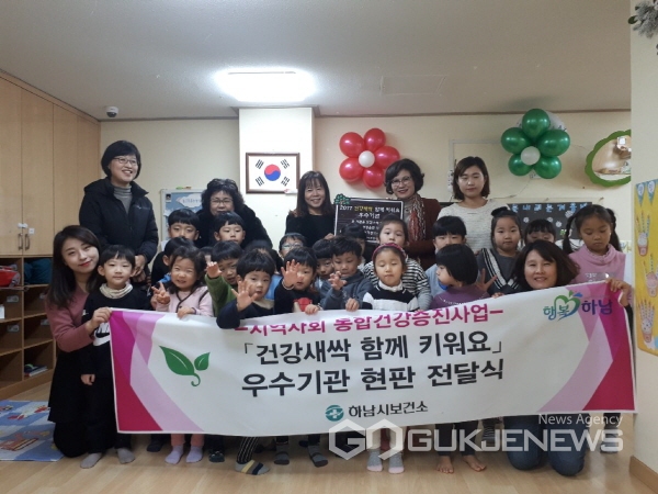 (하남=국제뉴스) 강성문 기자 = 하남시(오수봉 시장)는 20일 어린이집 및 유치원 대표 등이 참석한 가운데 2017년도 '건강새싹 함께 키워요!' 프로그램우수기관 3개소(시립참아름어린이집, 사랑몬테소리어린이집, 천현초병설유치원)에 대한 현판 전달식을 가졌다.