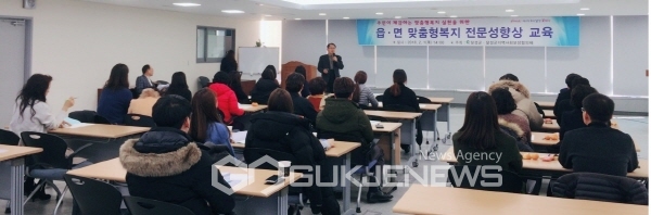 이날 교육에는 전북 익산시 영등1동 채수훈 맞춤형복지팀장을 초빙하여 ‘읍·면 맞춤형복지팀 역할 및 운영 활성화 방안’이라는 주제로 진행됐다. 주민 복지아카데미 교육, 찾아가는 복지사랑방 운영 등 영등1동 지역사회복지사업 사례에 대한 강의를 통해 찾아가는 복지서비스 사업에 대한 올바른 인식과 확실한 실천의지를 강화하는 계기가 되었다.